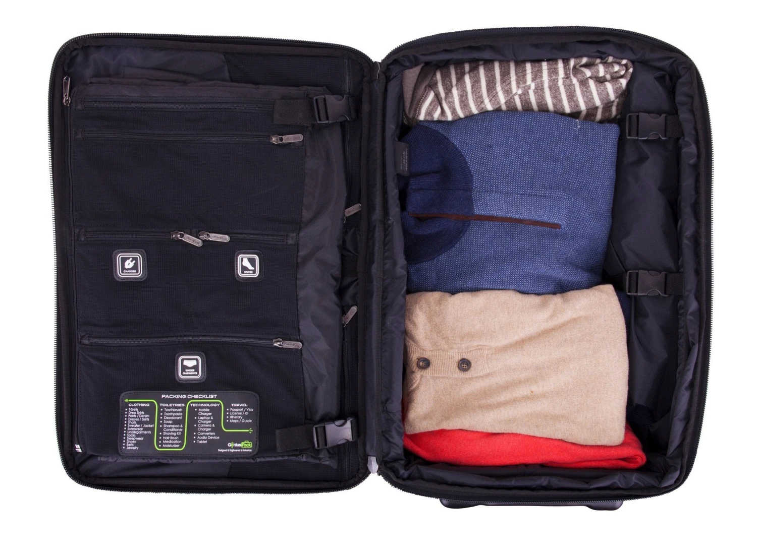 Pack more with this maximum capacity carry on. Recessed in-line silent-gliding wheels, makes it a breeze to roll. Integrated tri-fold suiter makes it easy to pack hanging clothes. Includes our signature patent-pending Laundry Compression Technology, engineered organizational panel, permanent checklist, sleek water bottle pocket, magazine compartment and more.