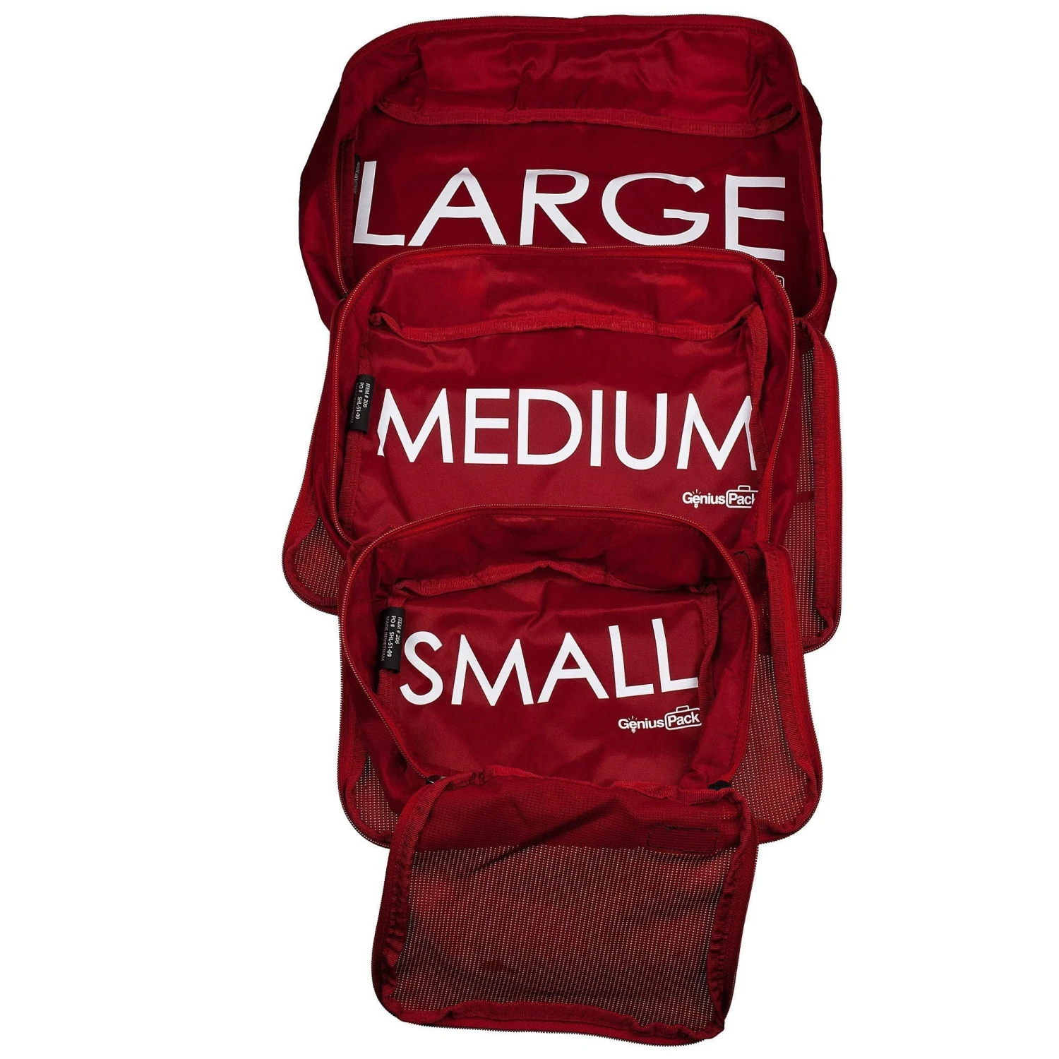 Set of 3 packing cubes- small, medium, large. You’ll be amazed by how much you can compress in these cubes! With it’s unique stretch-top mesh, it compresses the contents more than you can imagine. We had our CEO experiment & try to fit 13 dress shirts into the large cube, and they all fit! Really great to organize and customize the way you pack.