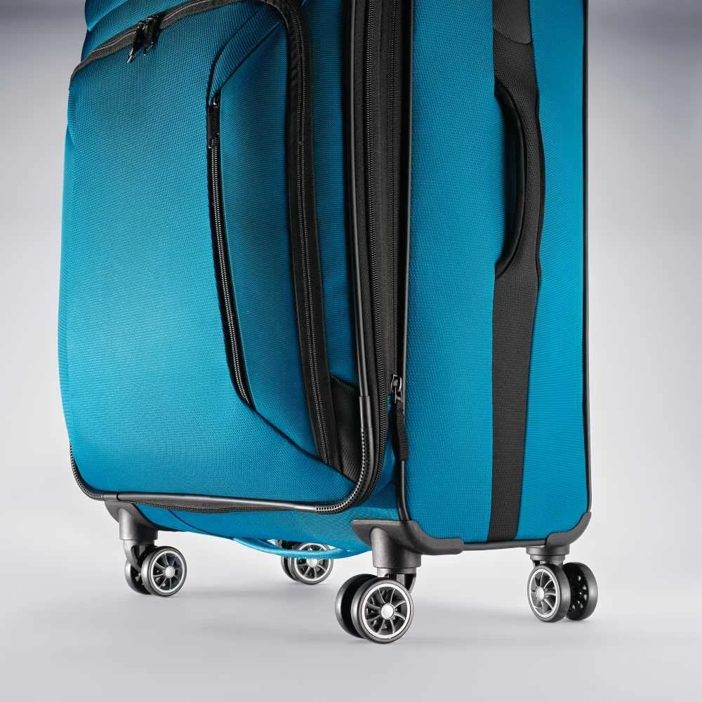 All cases expand 1.5″ for extra capacity.. Color pop interior with removeable TSA 3-1-1 pouch, cross straps and large diagonal blouse pocket with two additional packing pockets.. Inline integrated top and side carry handles with neoprene grips.. Carry-on features a “Go Pocket” which provides an easy access pocket for water bottles, snacks, books, etc.. Dual spinner wheels with gunmetal hubs and molded kissing zippers.