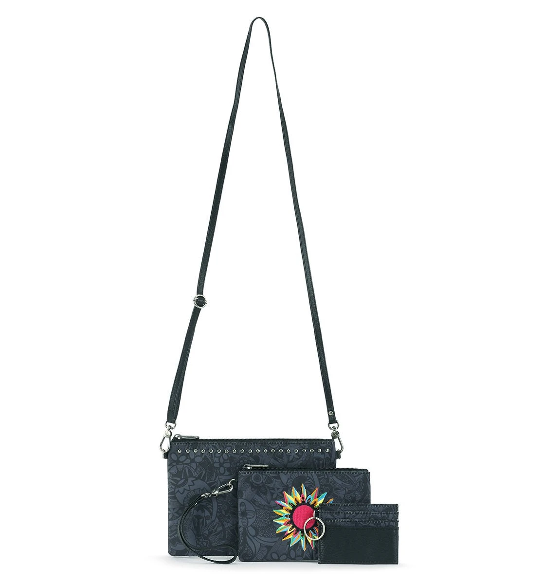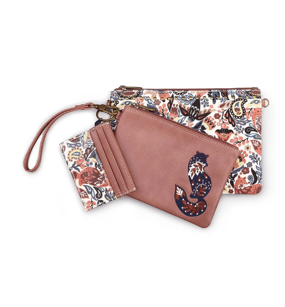 Perfect for gifting, traveling or just every day, our Adventure Triple Pouch includes a printed card case, an embroidered wristlet and a crossbody.