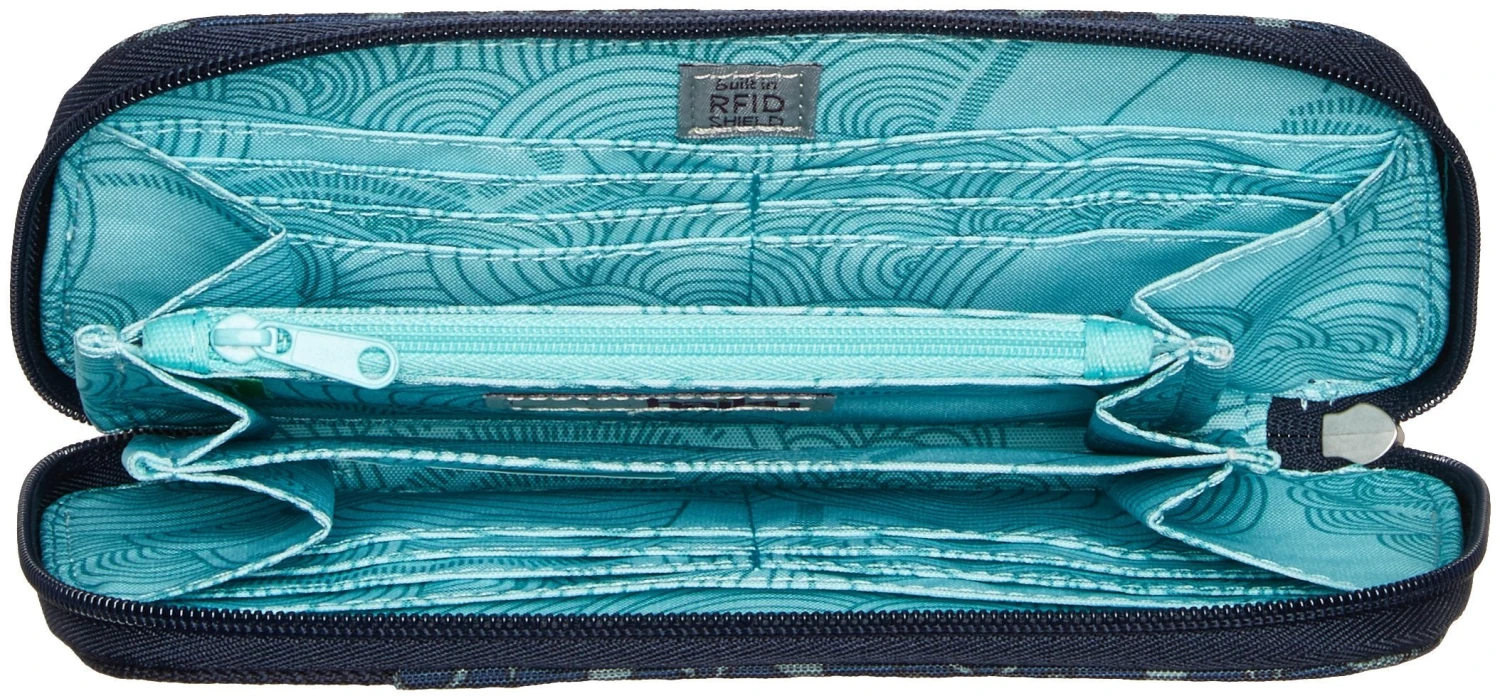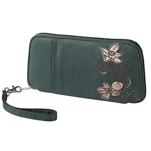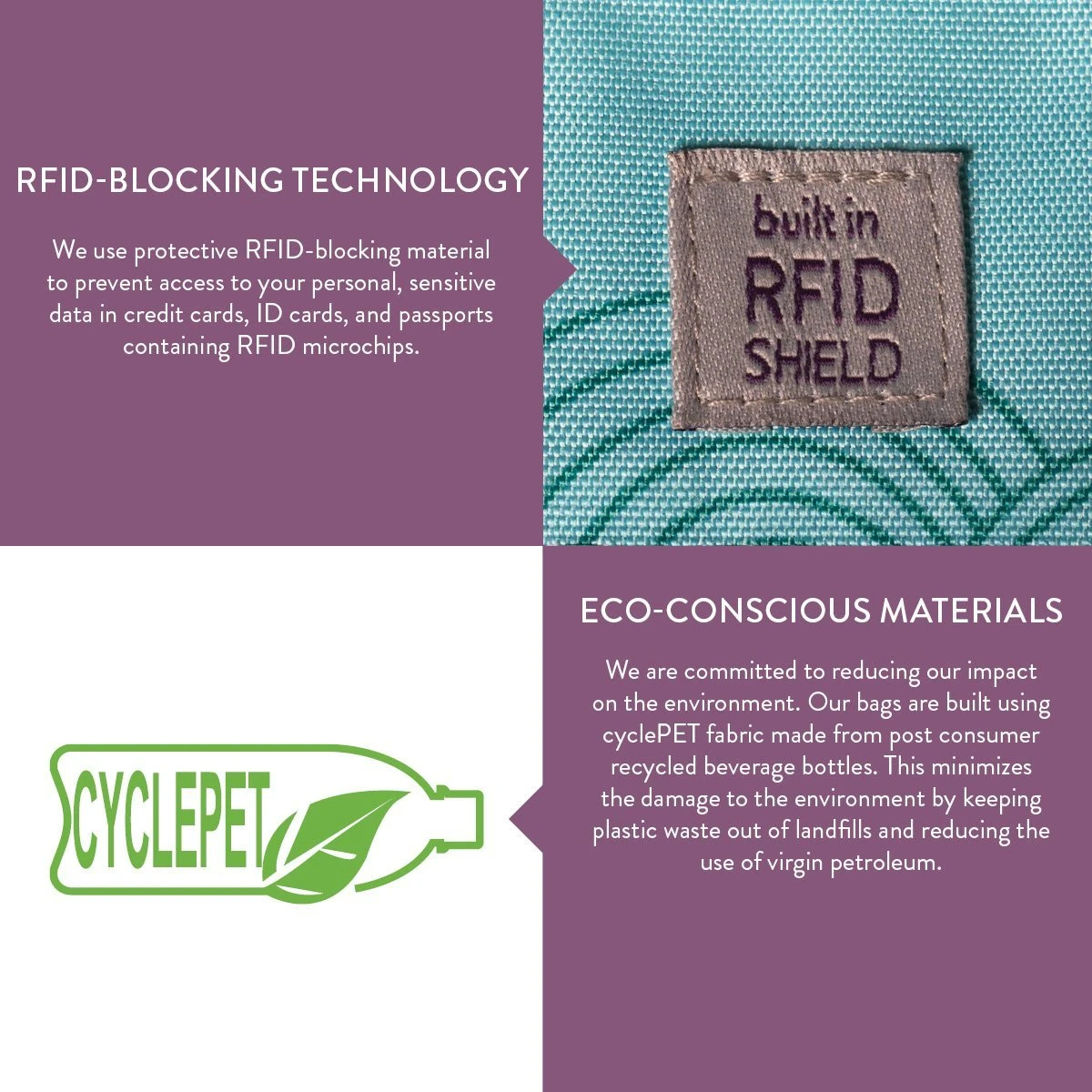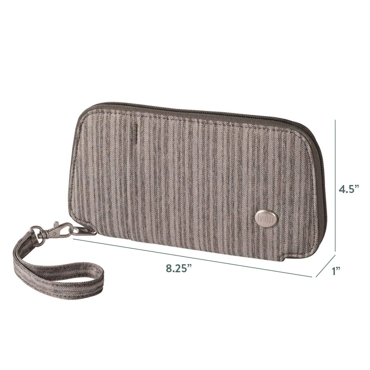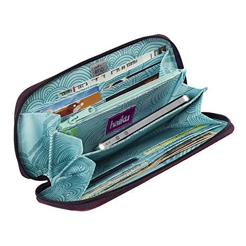 Water resistant lining and coating. Secure zip closure. Protective RFID blocking technology. 12+ card slots & zip coin pocket. Detachable wrist strap.