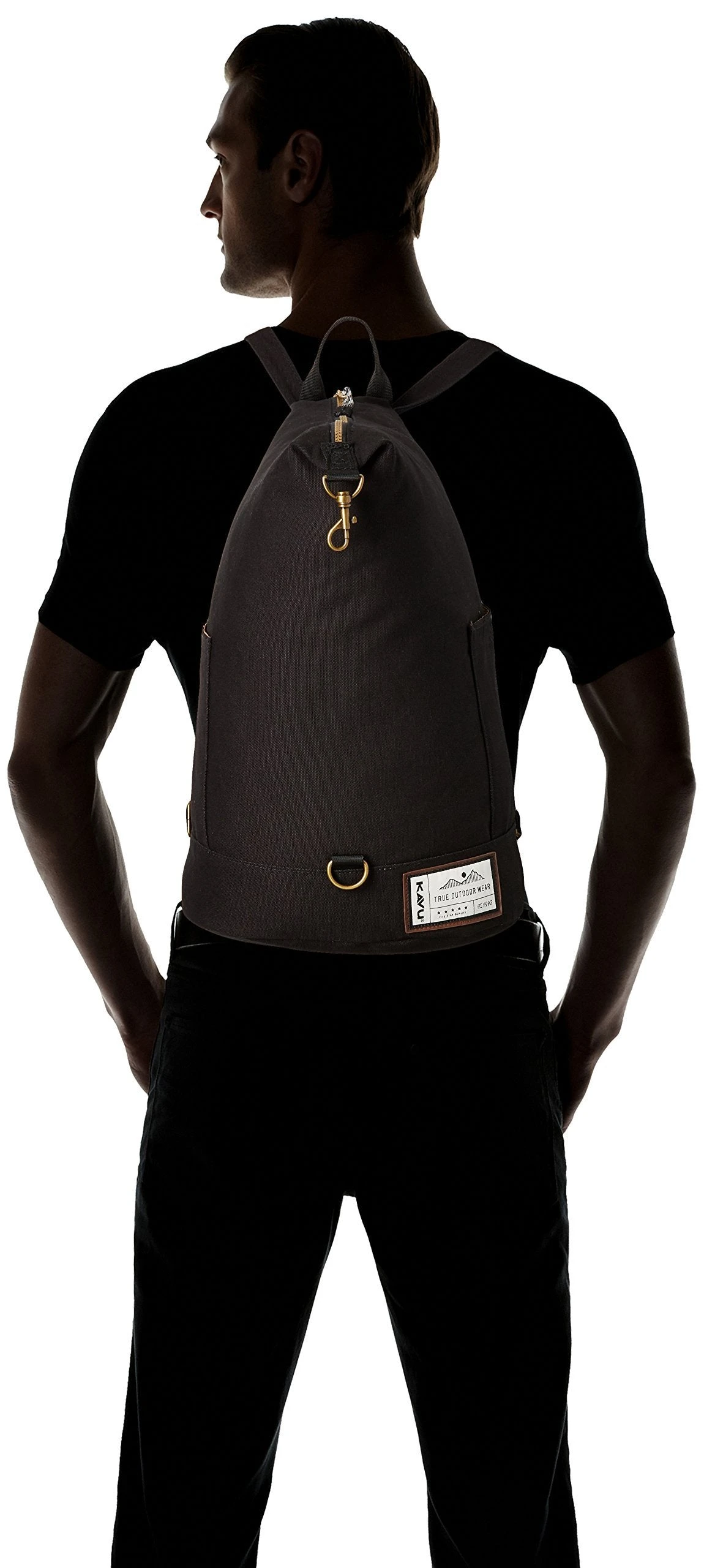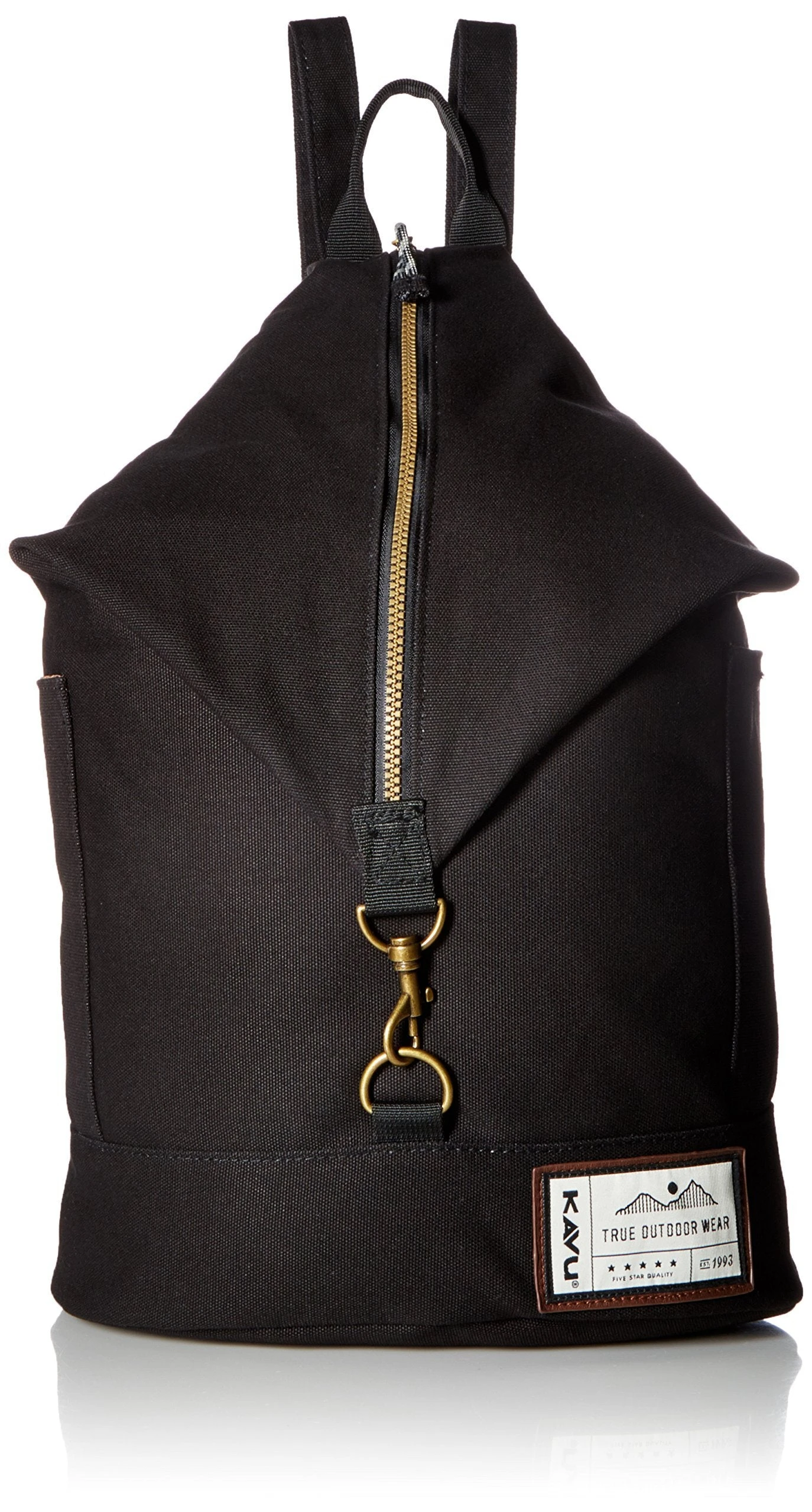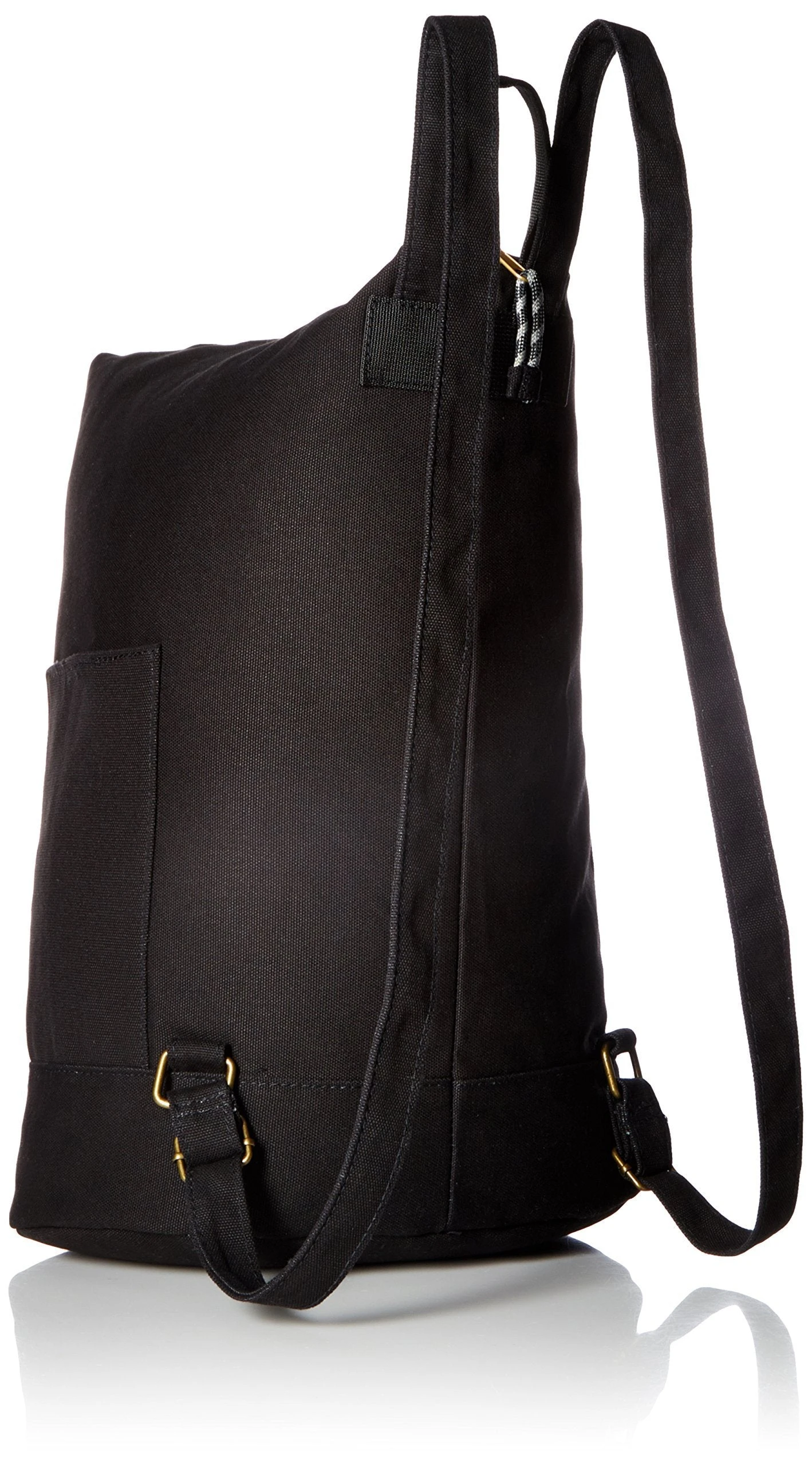 Backpack with adjustable shoulder straps, fixed hand strap, main compartment with zip and hook closure, two exterior side pockets with Velcro closure, interior zip pocket, padded bottom panel, antique brass hardware and faux metal zips with rope loop zip pulls.