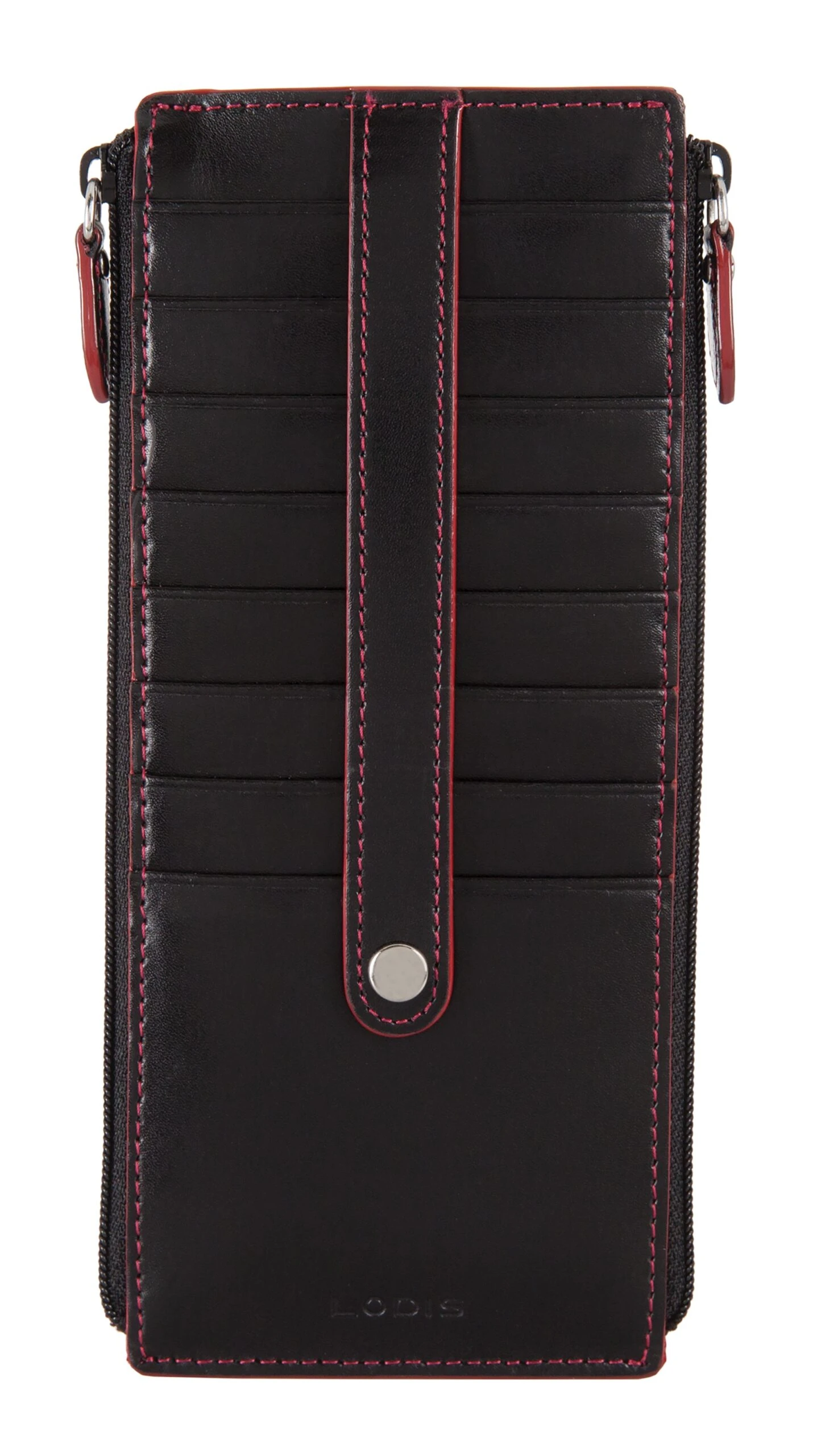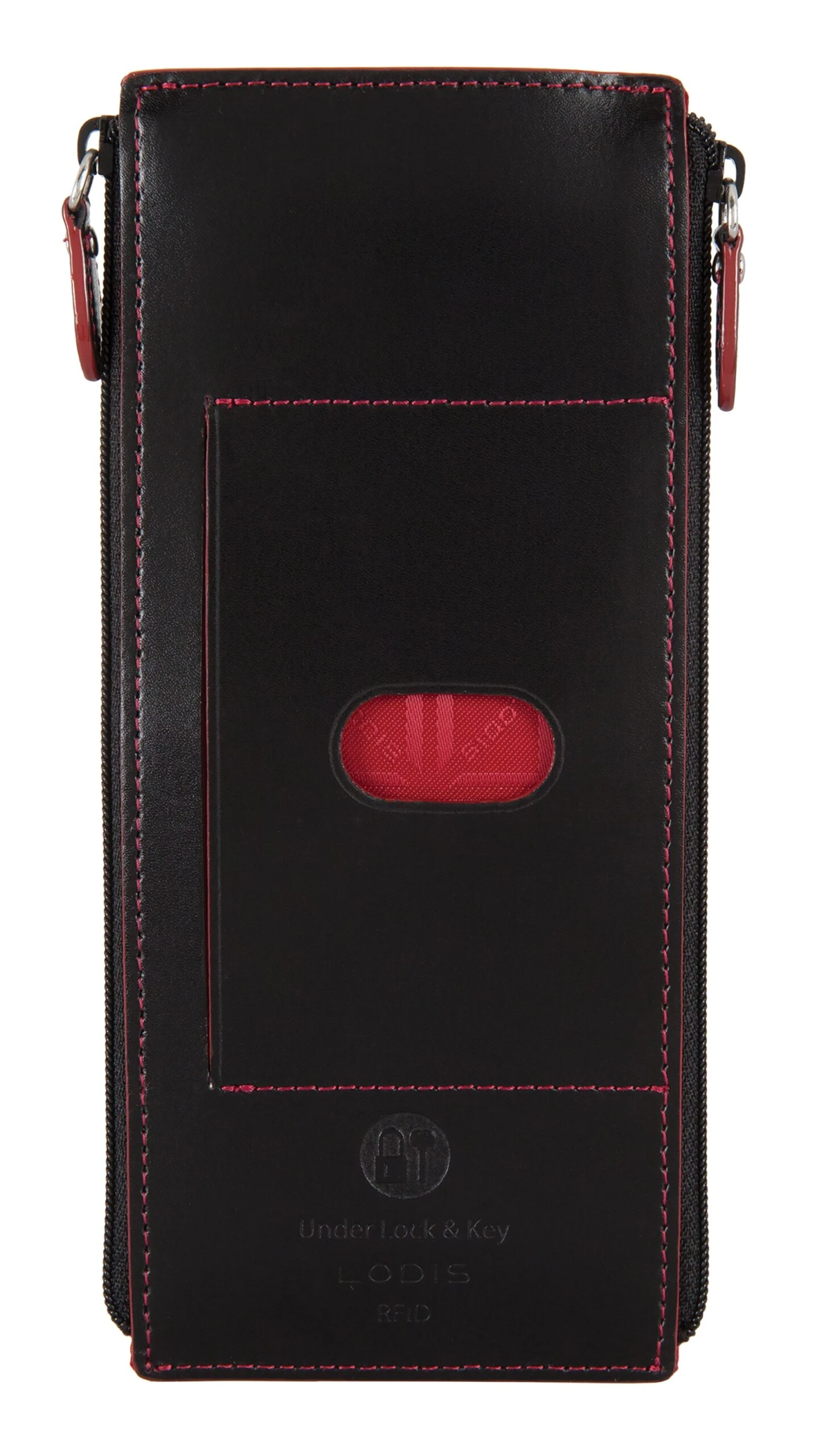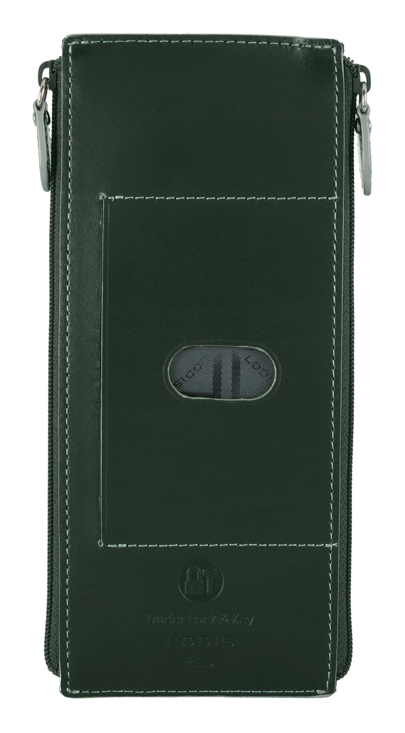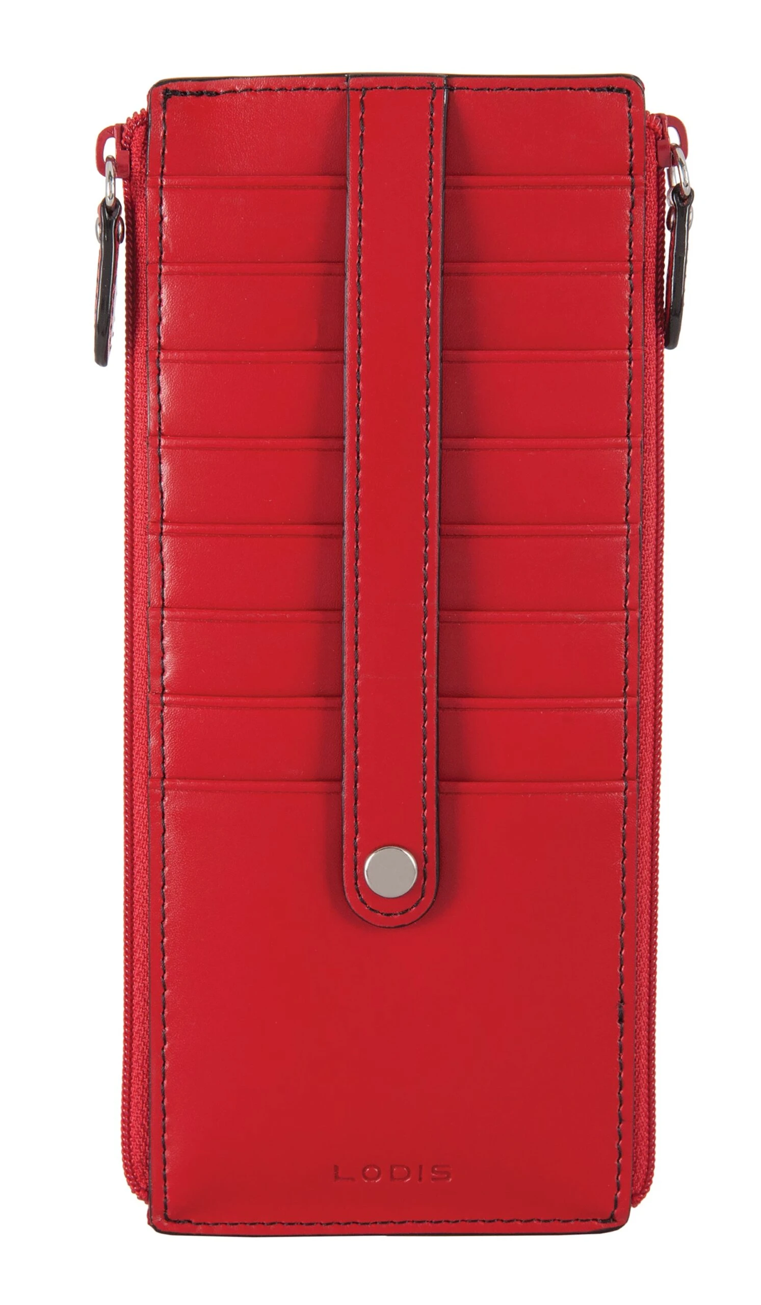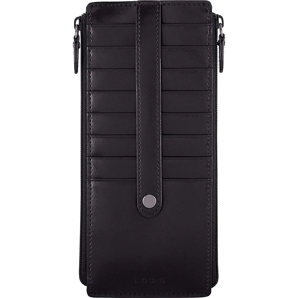 Quite simplychic, timeless beauty, refined and elegant. Smooth grain Italian leather, contrasting trim, and interiors featuring new Lodis organizational bag-moji icons and Lodis Under Lock and Key (trademark pending) RFID protection. Two zips are better than one. Our signature credit card stacker just got better with more space for your cards and a second zipper pocket for extra organization of bills and receipts. Features: 2 exterior zip pockets, rear ID slot with thumb glide, and 8 card slots with strap to securely holds cards in place. RFID protection in entire wallet when closed. One year warranty against manufacturing defects.