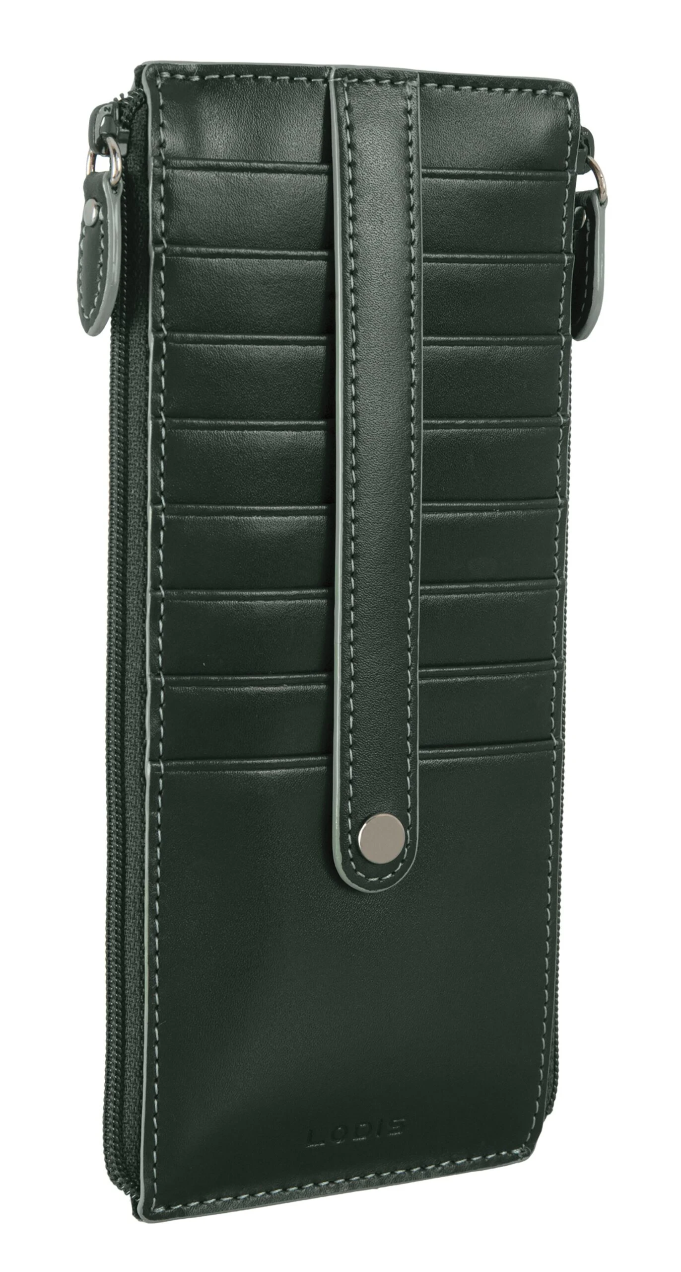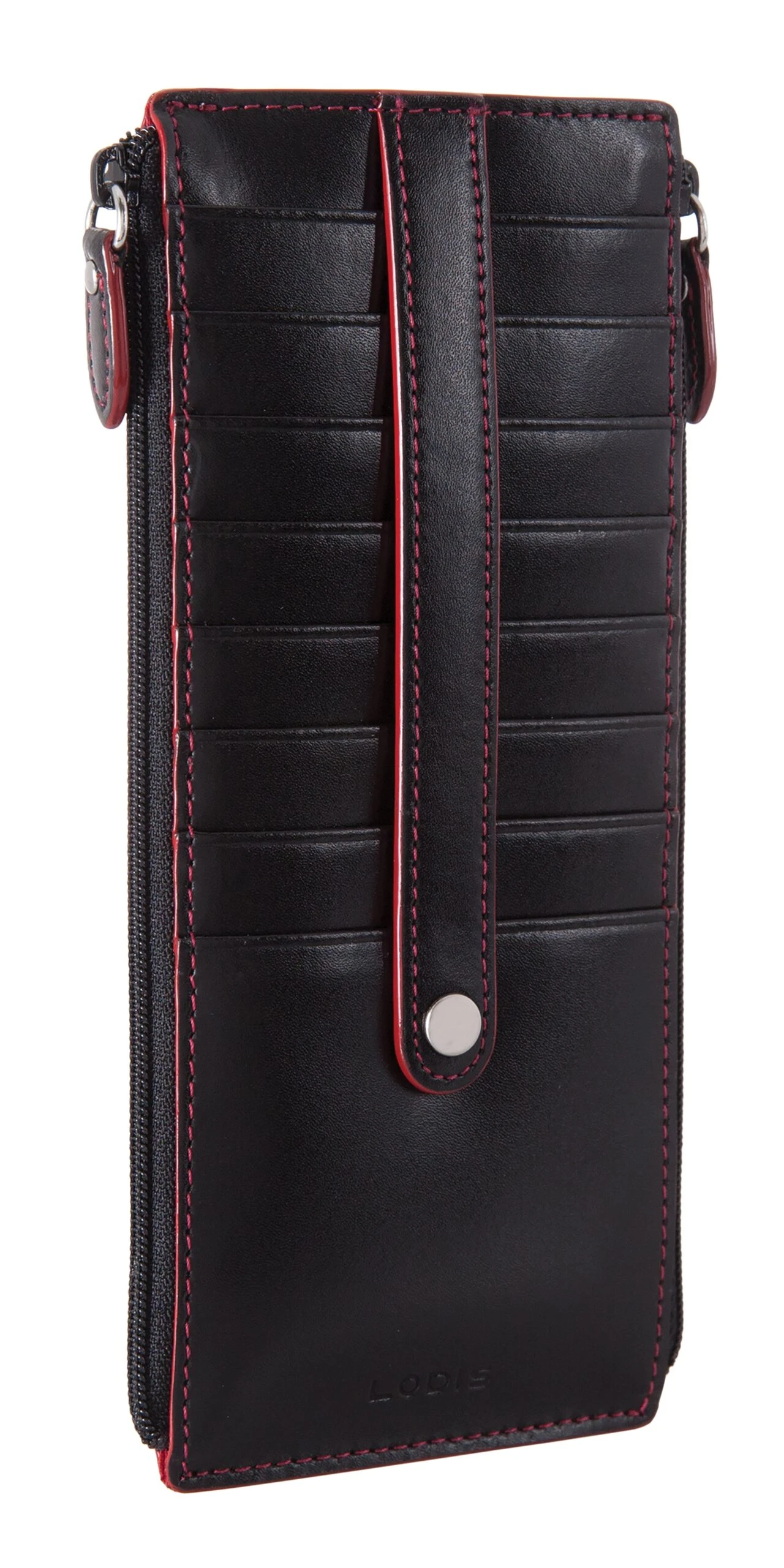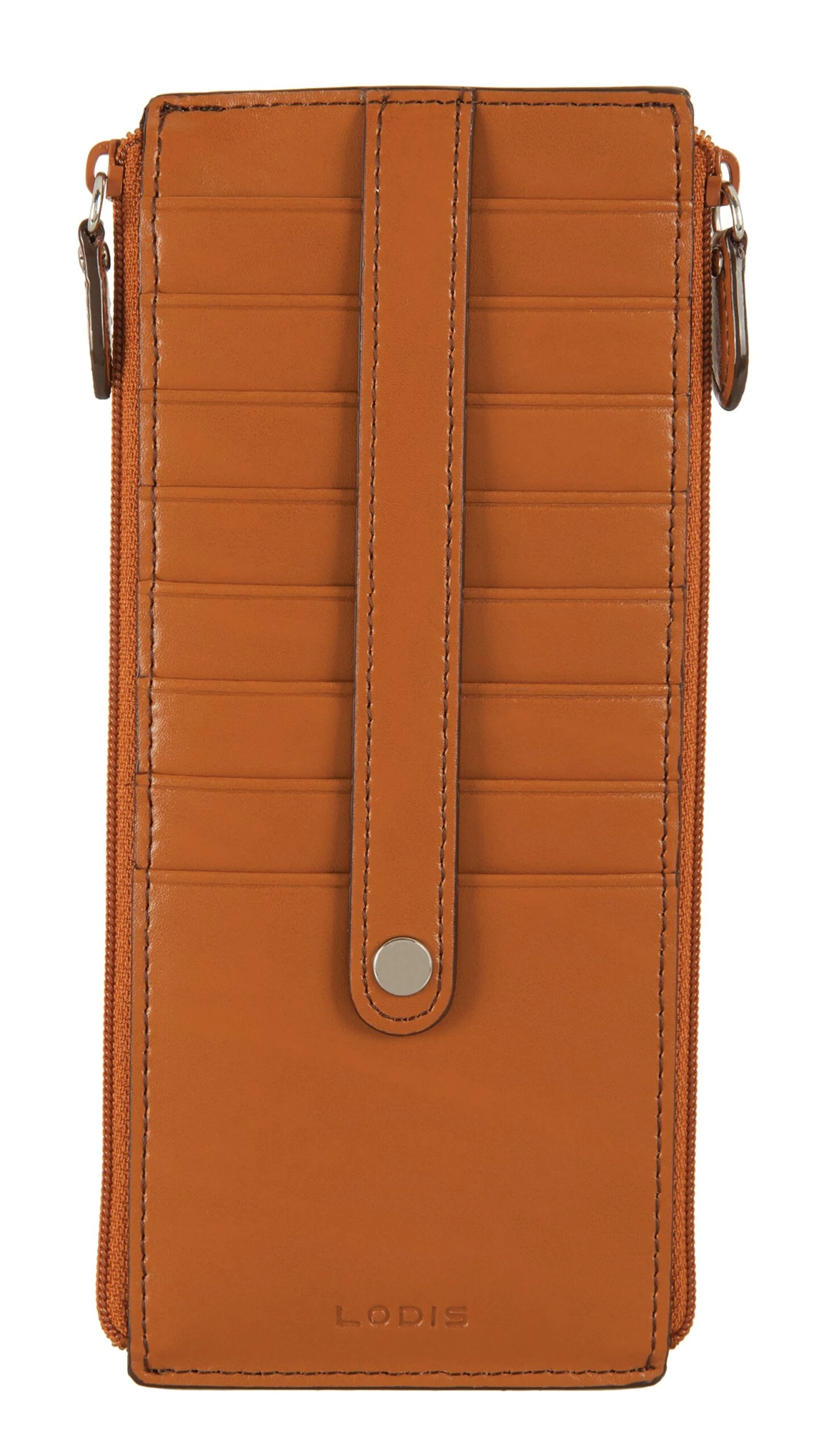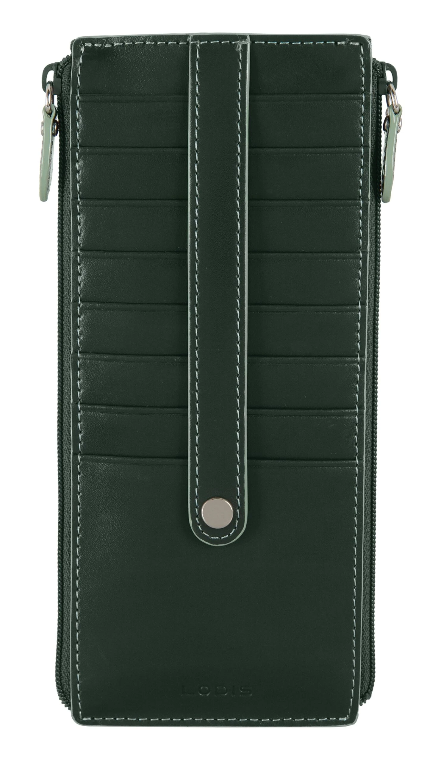 Quite simplychic, timeless beauty, refined and elegant. Smooth grain Italian leather, contrasting trim, and interiors featuring new Lodis organizational bag-moji icons and Lodis Under Lock and Key (trademark pending) RFID protection. Two zips are better than one. Our signature credit card stacker just got better with more space for your cards and a second zipper pocket for extra organization of bills and receipts. Features: 2 exterior zip pockets, rear ID slot with thumb glide, and 8 card slots with strap to securely holds cards in place. RFID protection in entire wallet when closed. One year warranty against manufacturing defects.