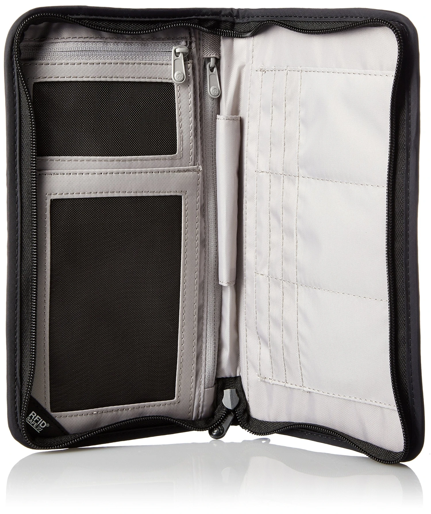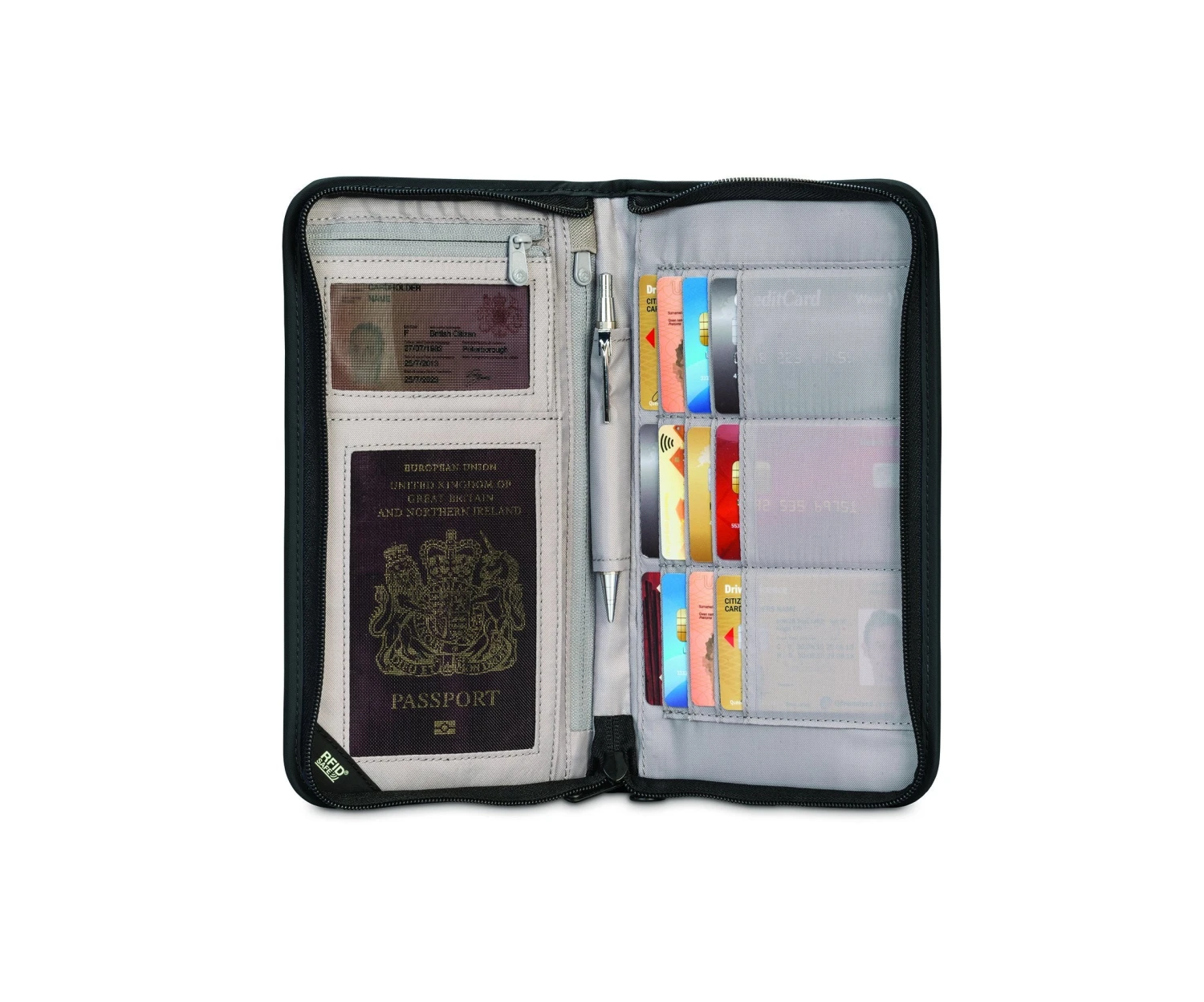 RFID blocking travel organizer with Dyneema webbing strap; ideal organizerthat blocks the transmission of sensitive information and gives peace of mindwhen traveling