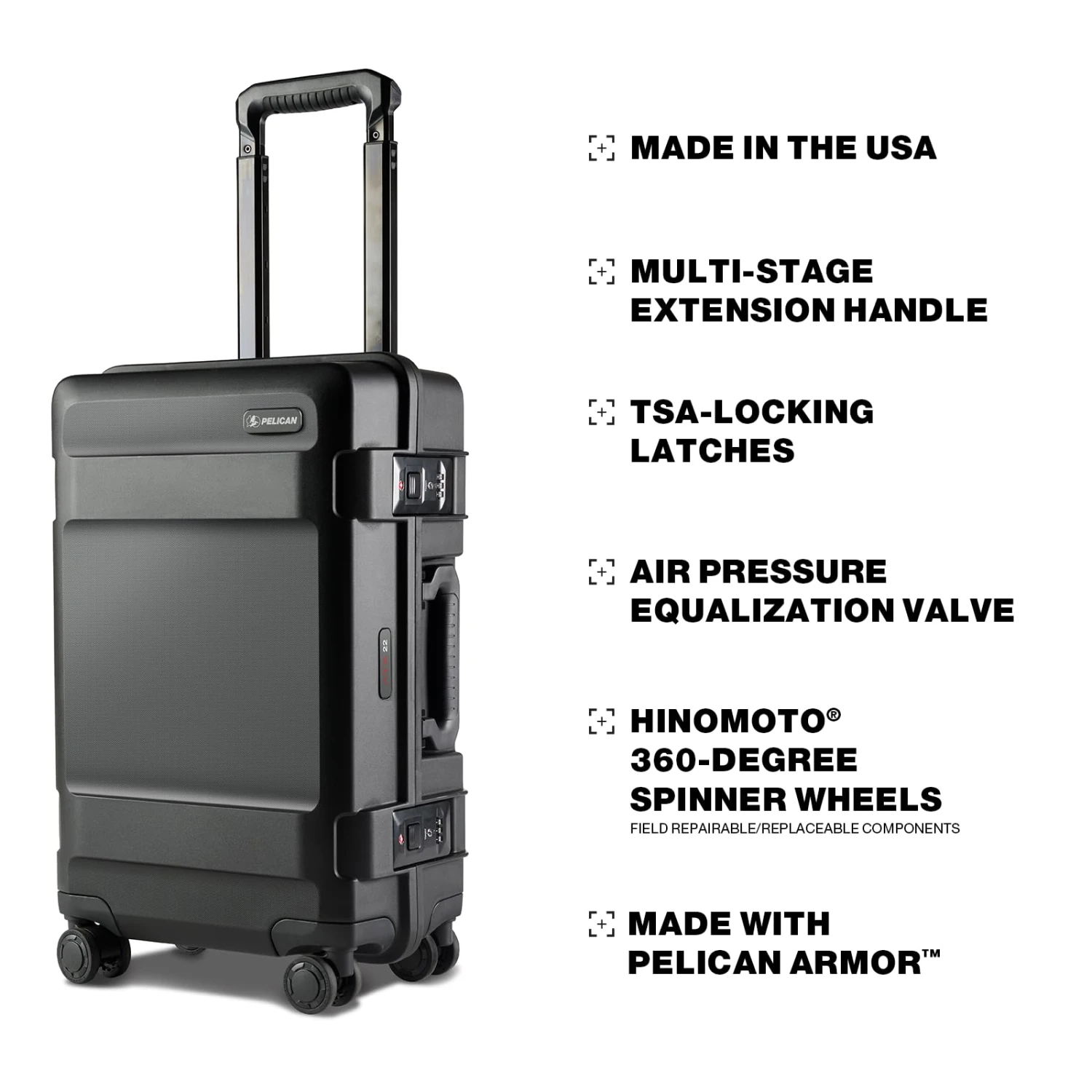The Pelican ATX Carry-on Luggage is a protective, premium hard-sided luggage designed for mission-critical adventures and everyday travel. It will safeguard all your belongings with unparalleled strength and style. The carry-on luggage features TSA locking latches, 360-degree spinner wheels, and telescoping handle. From the brand that has built premium cases for almost fifty years, the ATX carry-on luggage features Pelican Armor construction to protect your valuables. The ATX luggage provide legendary protection and convenience for the adventurous traveler.