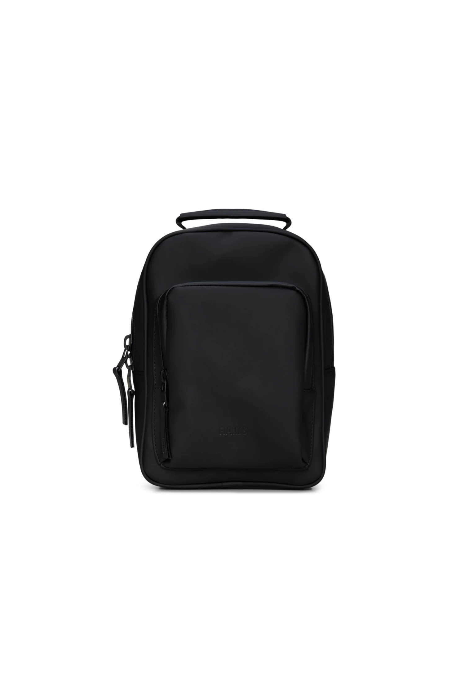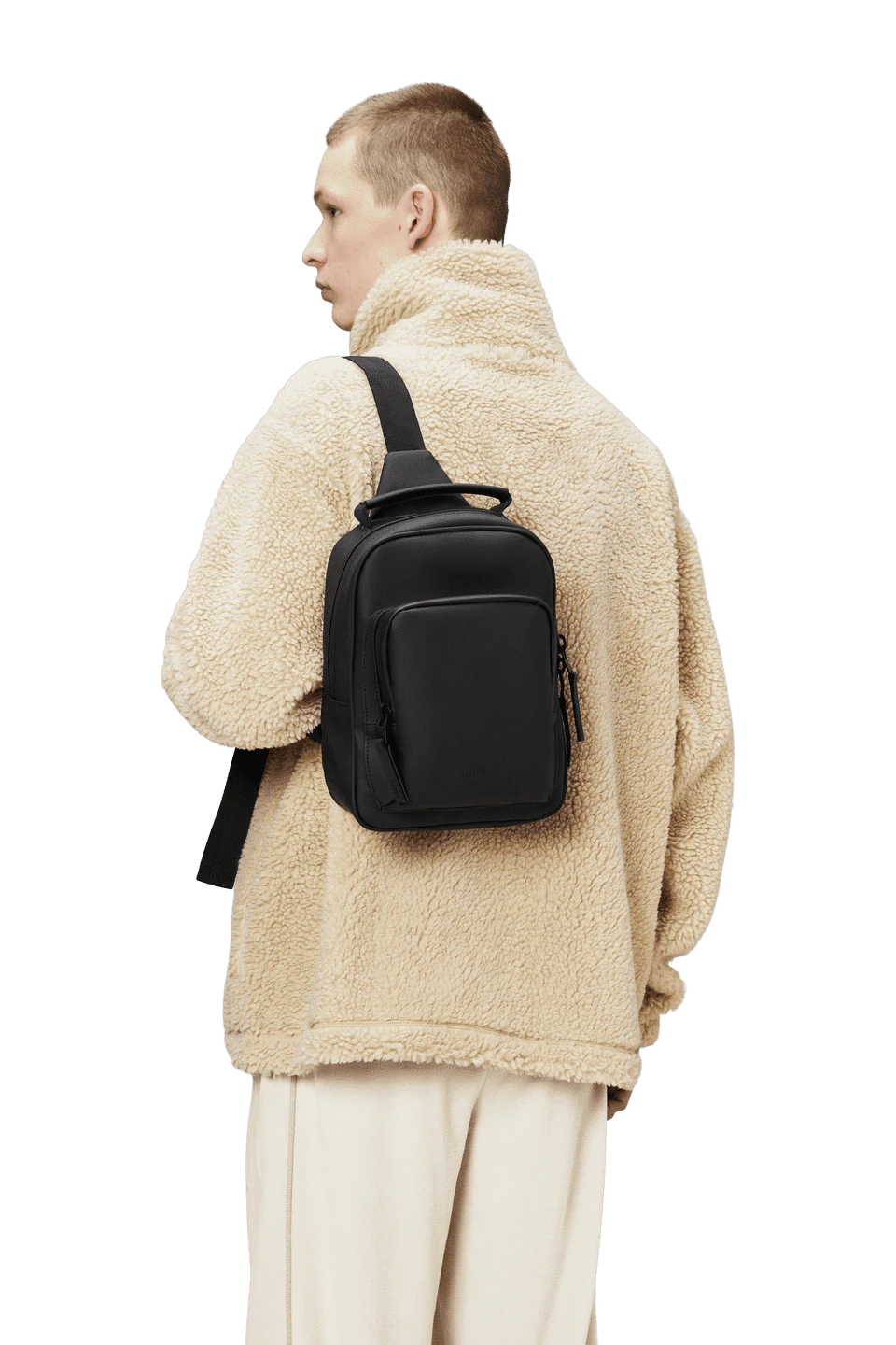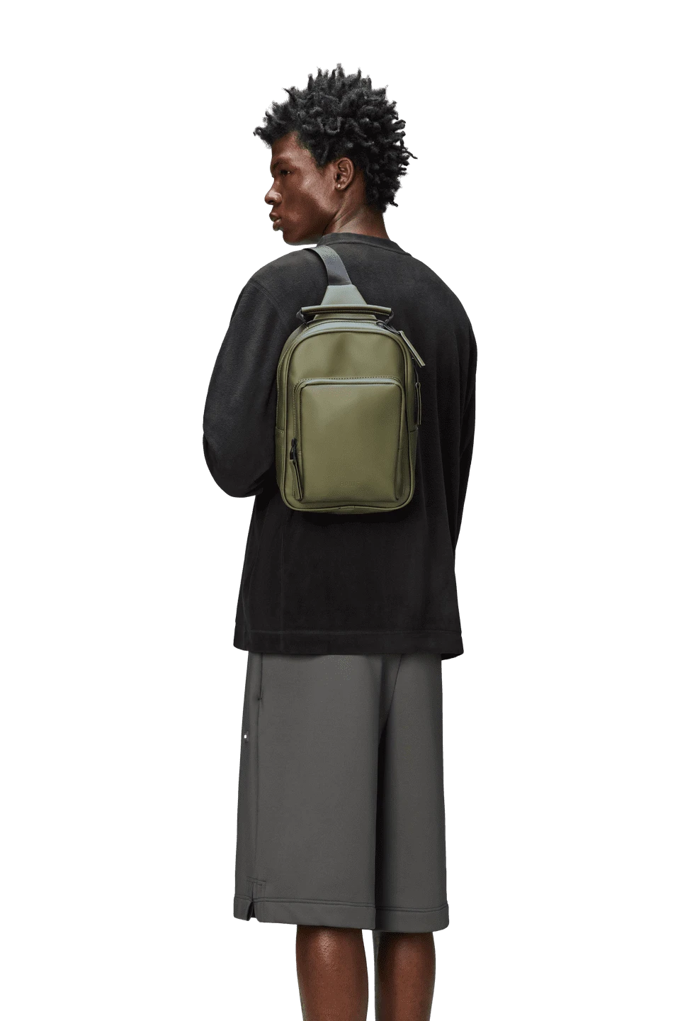 Book Daypack Mini is a compact version of Rains Book Daypack. Wear the monostrap as a sling over the shoulder or as an oversized bum bag. Book Daypack Mini is a clean, compact design characterized by fun, yet technical features that offer multiple uses. Wear it cross body as a sling bag over the shoulder with the adjustable monostrap, or clip it around the waist as an oversized bum bag. Perfectly designed for carrying smaller essentials day to day or when traveling. The design has a curved top, coated zip closures and front zip pocket. Open Book Daypack Mini to reveal a main compartment with an internal slip pocket. This style is finished with a webbing carry handle and padded mesh panels on the back for breathable comfort. Book Daypack Mini is cut from Rains signature waterproof PU fabric, engineered for carrying strength, durability and a smooth feel.