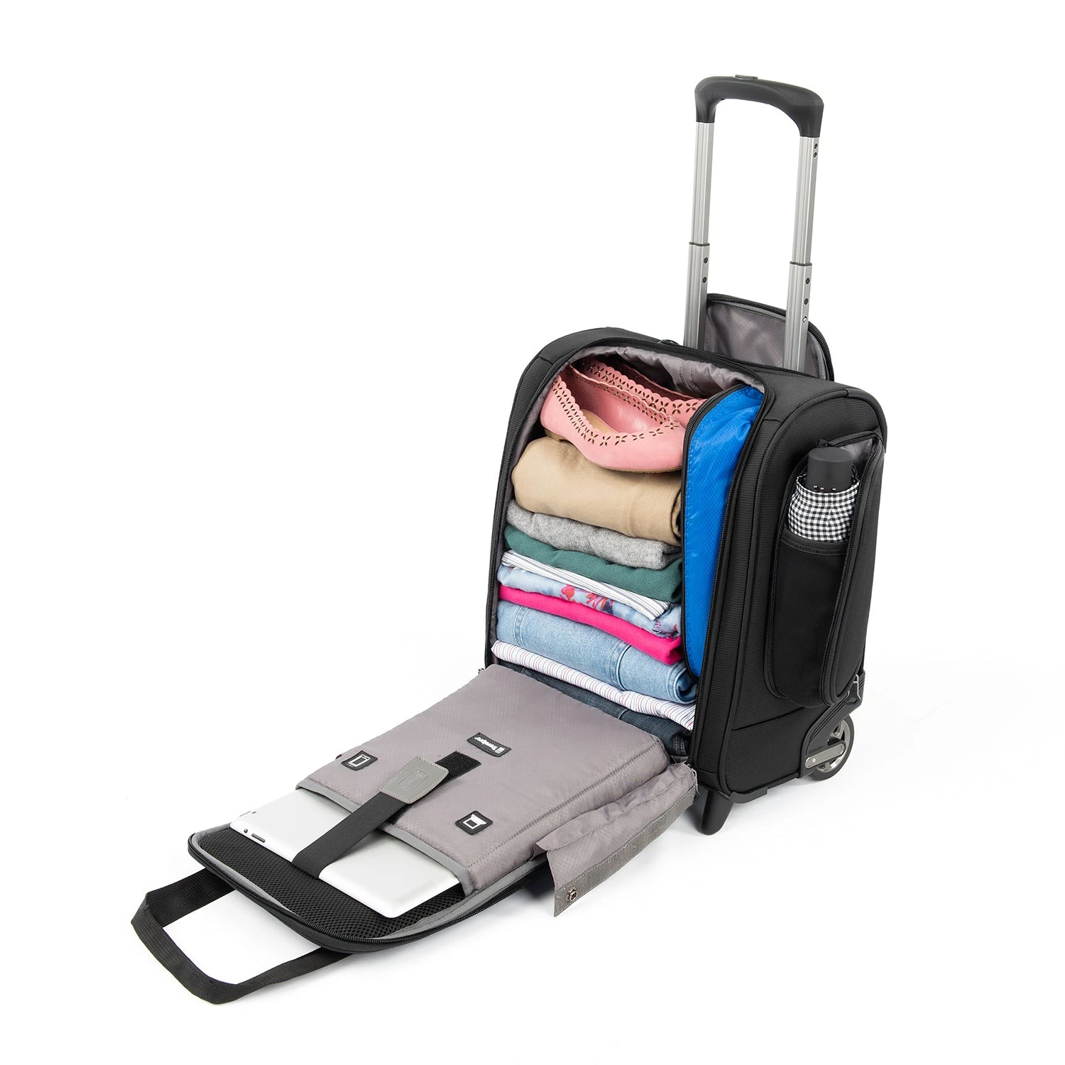 Like your personal tour guide, the Tourlite Rolling UnderSeat Carry-On will keep your travels organized and rolling smoothly. Designed to accommodate short trips on its own or be an accessory to other luggage, this compact bag is sized to fit under the seats of most domestic airlines. Keep your travel essentials close and convenient with built-in organization, including a padded laptop/tablet sleeve, roomy interior and exterior side pockets ideal for a water bottle or compact umbrella. Roll with ease on high performance inline skate wheels led by a lightweight PowerScope handle that extends to 42.5 for taller users, or use the rear stacking strap to secure the bag on top of any Rollaboard or spinner suitcase for secure stacking and hands-free mobility. Polyester fabric, treated to resist moisture and stains, looks great wherever your touring takes you! Backed by our Limited Lifetime Warranty.