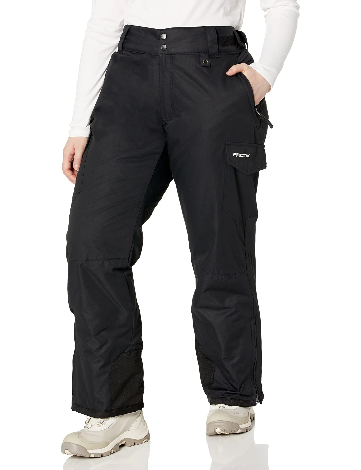 Season after season, the 1830 Arctix Women’s Cargo Snow Pants serve as an outstanding value priced ski/snow pants and a versatile cornerstone of the Arctix line. These pants feature a 100% Polyester Dobby shell with ThermaLock W/R + W/P 3000mm Coating, offering a maximum degree of durability and protection from the elements, while allowing a full range of motion. 85 grams ThermaTech Insulation offers warmth in a lightweight, low bulk garment, keeping you warm at temperatures from -20 to +35 depending on your level of activity. DWR finish (Durable Water Repellent) helps repel water from fabric surface. Articulated knees allow for a more unrestricted range of motion and comfort as you climb, hike, or ski/snowboard. The adjustable waist ensures a comfortable fit, while boot zippers make them easy for on and off access over boots. Boot gaiters with grippers form a seamless integration with the boots to keep the warmth in, and the moisture out. These relaxed fit pants also include 600 Denier Ballistic reinforced ankle, scuff and hem guards to hold up against daily wear & tear, and conveniently has cargo pockets for extra storage and an O-ring for keys, gloves and/or lift tickets. The pants provide zippered hand warmer style pockets, a zippered fly, and belt loops. They are water and wind resistant, and are machine washable.